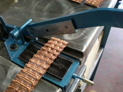 The die-set within the machine, stamps 3 simple corrugations repeatedly into the copper film as it passes through the dies towards the indexed guillotine. The film is stamped and moved forward using the "cam action" of the lower set of dies.